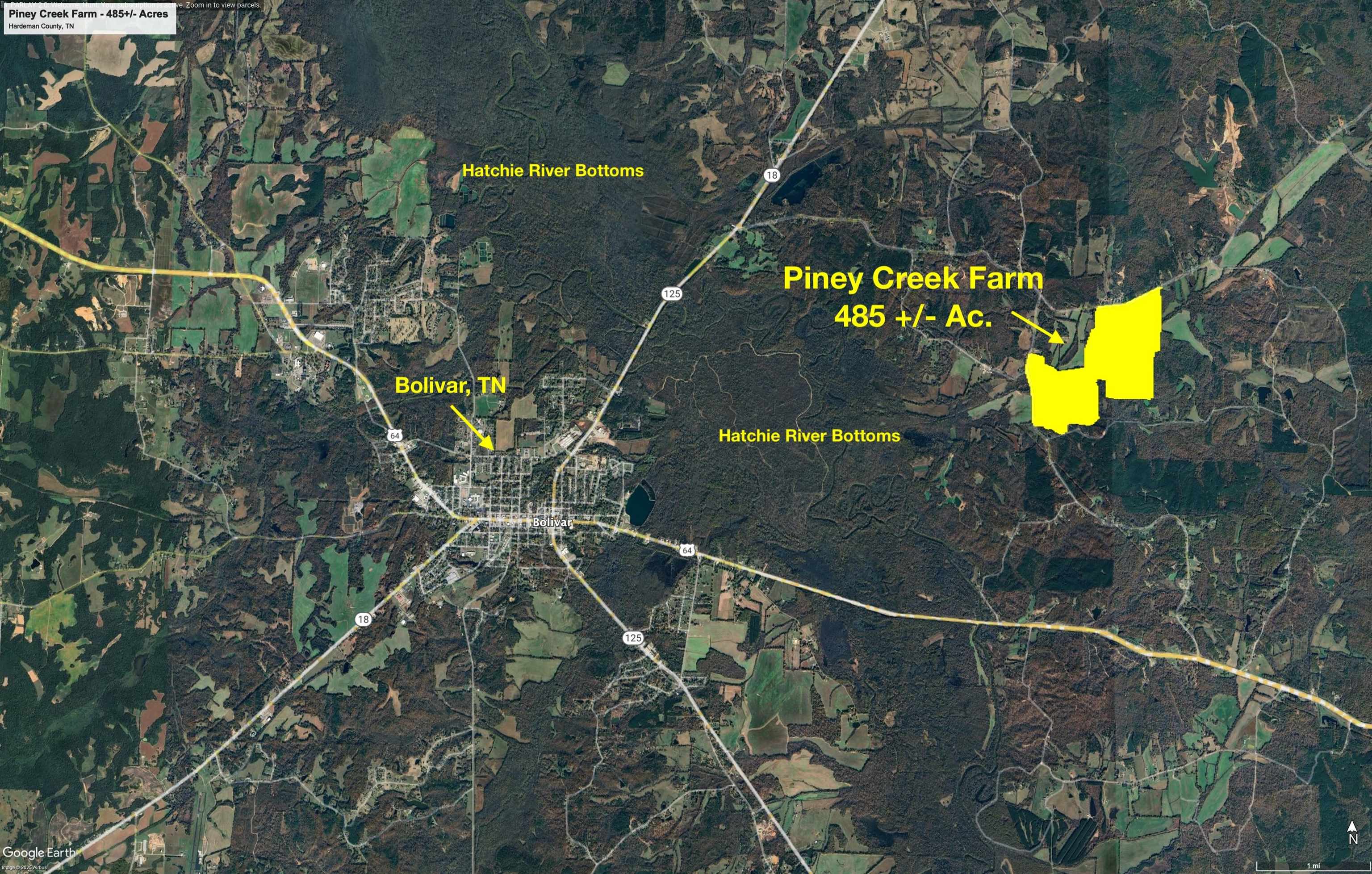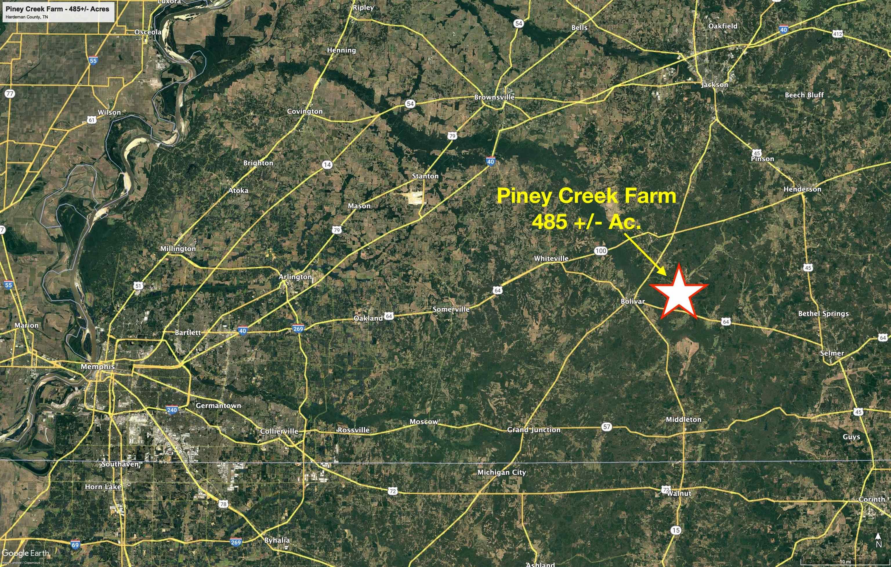 Great investment tract. The property produces $40,000+ of annual income from a row crop farm & hunting lease. The property boasts frontage on 3 different county roads totaling over 1.2 miles of paved road frontage. This road frontage would allow the property to be subdivided with multiple hobby farms or house lots being sold and the core of the farm to be retained by the owner. 485 +/- total acres (215 +/- tillable acres), several great building sites, existing well and power are on property, over 1 mile frontage on Piney Creek, great deer, turkey, duck, and small game hunting opportunities. Only 10 minutes from Bolivar which has a full-service grocer: Memphis, TN (1 hr. 15 minutes), & Jackson, TN (35 minutes). Call today to arrange a tour of this unique property.
