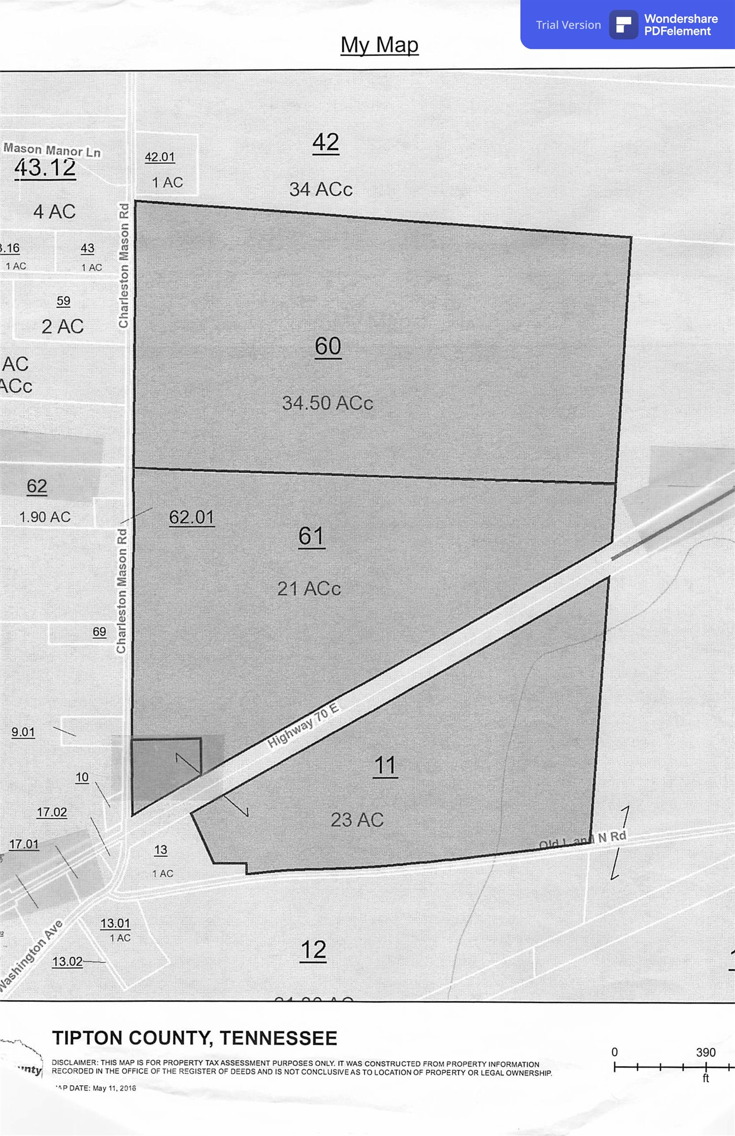 Sale comprises 3 parcels of property, lots 60, 61, and 11 as shown on the attached plat for a total of 78.5 acres, more or less. Property is zoned FAR. 48 Acres, more or less, are leased for farming and in row crops through the end of the year, but the lease can be bought out. Property being sold for development. Five miles from Ford Tennessee Truck Plant. Railroad access nearby. GIS maps not accurate. 16 acres south of Hwy 70, 62.5 acres on the north side.